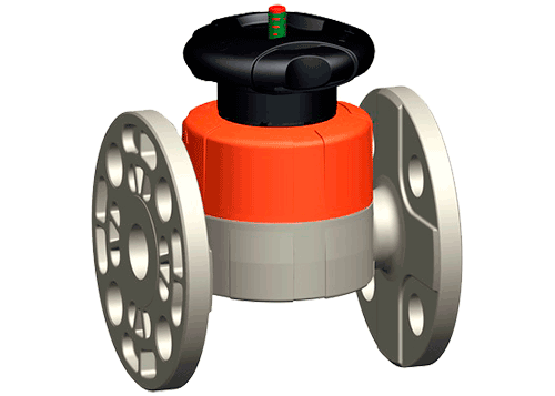 The Type 514-519 diaphragm valves from GF Piping Systems incorporate features never before seen in a plastic diaphragm valve. The valve has Cv values that average at least double the conventional design. This high-flow design allows the valve to be used where diaphragm valves were previously not possible due to flow restriction. In addition, the new design eliminates the four bolts used to hold the valve together. This eliminates a corrosive weak point. The Type 519 zero-static version uses the pipe wall as the weir and provides for maximum purity and drainability. The valve is available in PVC, CPVC, PP, PP-n, and PVDF. Standard versions can handle up to 150 PSI. All PVDF and an optional PVC version allow for pressures as high as 240 PSI.