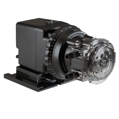 The Classic Series single head adjustable metering pump is built with three detachable components; the motor, feed rate control, and the QuickPro® pump head. The output is determined by three factors; the RPM of the motor gears, the percentage setting on the feed rate control and the size of the pump tube. The motor shaft rotates at a fixed RPM, which drives the feed rate control to intermittently engage the roller assembly within the pump head according to the setting on the external dial ring. The dial ring is labeled L to 10 and has a 20:1 turndown. The QuickPro® pump head makes tube replacement easy and convenient without the use of tools and the pump itself is simple to service or convert to another model.