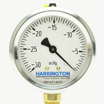 Harrington Model 213.53 Industrial Pressure Gauge, Glycerin-Filled, Copper Alloy Wetted Parts, 304 Stainless Steel Case, EPDM Seal, 2-1/2" Dial, 1/4" NPT Connection, Lower Mount, 30 inHg Vacuum, ± 2/1/2% of Span Accuracy