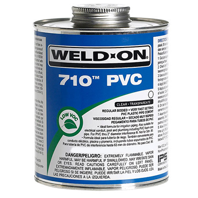 Weld-On® 710™ is a clear, low VOC emission, regular bodied, very fast setting cement for all classes and schedules of PVC with interference fit through 2" diameter, (except Schedule 80). It is specially formulated for irrigation piping and is also suitable for electrical conduit, pool & spa and plumbing, including PVC foam pipe. 710™ is available in 1/4 pint, 1/2 pint, pint, quart and gallon metal cans. It is LEED compliant and meets ASTM D 2564 standards and SCAQMD Rule 1168/316A. It has a shelf life of three years in a tightly sealed container.