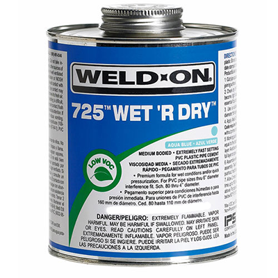 Weld-On® 725 Wet 'R Dry™ is an aqua blue, low VOC emission, medium bodied, extremely fast setting, high strength PVC solvent cement for all classes and schedules of pipe and fittings with interference fit through 6" in diameter, Schedule 80 through 4" in diameter. 725 Wet 'R Dry™ is specially formulated for applications where conditions are wet and/or quick pressurization is desired. It was developed to answer specific needs in irrigation, plumbing, and/or pool & spa applications. Can be used without primer on non-pressure systems if local codes permit. 725 Wet 'R Dry™ is available in 1/4 pint, 1/2 pint, pint, quart and gallon metal cans. LEED compliant, meets ASTM D 2564 standard and SCAQMD rule 1168/316A . Product has a shelf life of three years in a tightly sealed container.