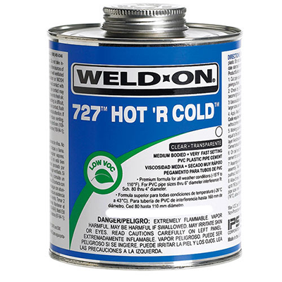 Weld-On® 727 Hot 'R Cold™ is a clear, low VOC emission, medium bodied, very fast setting high strength PVC solvent cement for all classes and schedules of pipe and fittings with interference fit through 6" diameter, Schedule 80 through 4" in diameter. 727 Hot 'R Cold™ is specially formulated for use in a wide range of temperatures encountered during all seasons of the year. Successful, high strength joints can be made at temperatures as low as - 15° F and as high as 110° F. It is suitable for use on rigid and flexible PVC pipe and fittings and can be used in very wet conditions and/or where quick pressurization of the piping systems is desired. 727 Hot 'R Cold™ is available in pint, quart and gallon metal cans. Can be used without primer on non-pressure systems if local codes permit. Meets ASTM D 2564 Standard and SCAQMD rule 1168/316A. LEED compliant. Shelf life is three years in a tightly sealed container.