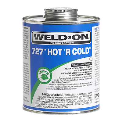 Weld-On® 727 Hot 'R Cold™ is a clear, low VOC emission, medium bodied, very fast setting high strength PVC solvent cement for all classes and schedules of pipe and fittings with interference fit through 6" diameter, Schedule 80 through 4" in diameter. 727 Hot 'R Cold™ is specially formulated for use in a wide range of temperatures encountered during all seasons of the year. Successful, high strength joints can be made at temperatures as low as - 15° F and as high as 110° F. It is suitable for use on rigid and flexible PVC pipe and fittings and can be used in very wet conditions and/or where quick pressurization of the piping systems is desired. 727 Hot 'R Cold™ is available in pint, quart and gallon metal cans. Can be used without primer on non-pressure systems if local codes permit. Meets ASTM D 2564 Standard and SCAQMD rule 1168/316A. LEED compliant. Shelf life is three years in a tightly sealed container.
