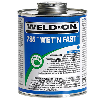 Weld-On® 735 Wet 'N Fast™ is a blue, low VOC emission, medium bodied, extremely fast setting, high strength PVC solvent cement for all classes and schedules of pipe and fittings with interference fit through 6" diameter, Schedule 80 through 4" in diameter. For use on rigid and flexible PVC pipe and fittings, including PVC foam core DWV. It is specially formulated for applications where conditions are wet and/or quick pressurization of the piping systems is desired. It was developed to answer specific needs in the plumbing industry but may also be used in irrigation, pool, spa and other applications. Can be used without primer on non-pressure systems if local codes permit. This product is available in 1/4 pint, 1/2 pint, pint, quart and gallon metal cans. Meets SCAQUD rule 1168/316A and ASTM D2564 standard. LEED compliant. Shelf life of three years in a tightly sealed container.