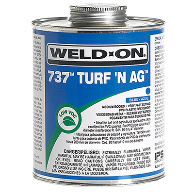 Weld-On® 737 Turf 'N Ag™ is a blue (fades to clear in sunlight), low VOC emission, medium bodied, very fast setting, high strength PVC solvent cement for all classes and schedules of pipe and fittings with interference fit through 8" diameter, Schedule 80 through 4" in diameter. For use on rigid and flexible PVC pipe and fittings, including foam core and well casing. It is specially formulated for applications where conditions are very wet and/or quick pressurization is desired. Although developed to answer specific requirements of the irrigation and agriculture markets, it is also suitable for use in plumbing and other applications. Can be used without primer on non-pressure systems if local codes permit. 737 Turf 'N Ag™ is available in 1/4 pint, 1/2 pint, pint, quart and gallon metal cans. Meets SCAQMD rule 1168/316A and ASTM D 2564 Standard. Shelf life of three years in a tightly sealed container.