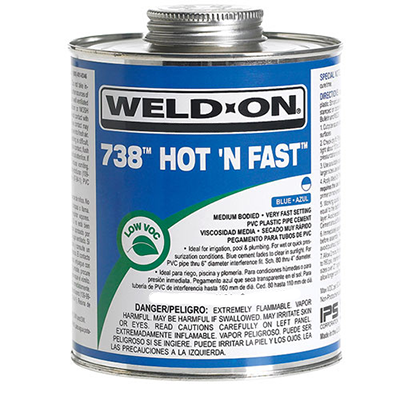 Weld-On® 738 Hot 'N Fast™ is a blue (fades to clear in sunlight), low VOC emission, medium bodied, very fast setting, high strength PVC solvent cement for all classes and schedules of pipe and fittings with interference fit through 6" diameter, Schedule 80 through 4" diameter. For use on rigid and flexible PVC pipe and fittings, including foam core and well casing. It is specially formulated for high-strength, fast-setting applications where conditions are wet, dry and/or quick pressurization is desired. 738 Hot 'N Fast™ is ideal for irrigation and agriculture applications as well as pool/spa and plumbing uses. Can be used without primer on non-pressure systems if local codes permit. Available in 1/2 pint, pint, quart and gallon metal cans. Meets SCAQMD rule 1168/316A and ASTM D 2564 standard. LEED compliant. Shelf life of three years in a tightly sealed container.