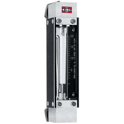 The King Instrument series 7450 flowmeter is a side plate style meter with either a 75mm (3") or 150mm (6") borosilicate glass tube and 316L stainless steel or brass connections. This meter is also available with PVC ends and Hastelloy® C-276 construction for greater chemical resistance. Series 7450 offers the following scale ranges; 0.48 to 7.4 GPM and 2 to 20 SCFM. The connection size for Series 7450 is a 3/8" female pipe thread and is designed to install horizontally. The internal components are 316L stainless steel. The fitting material options are Brass or 316L stainless steel. O-rings are Viton® standard with optional Buna-N, EPR or Kalrez®. Accuracy is ± 5% of full scale flow at 75mm and ± 3% of full scale flow at 150 mm. Turndown is 10:1 and repeatability is 1%.