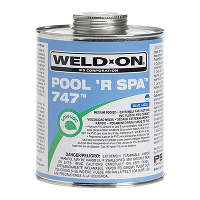 Weld-On® 747 Pool 'R Spa™ is a blue (fades to clear in sunlight), low VOC emission, medium bodied, extremely fast setting, high strength PVC solvent cement for all classes and schedules of pipe and fittings with interference fit through 6" diameter, Schedule 80 through 4" diameter. It is for use on both rigid and flexible PVC pipe and fittings. Specially formulated for applications where conditions are very wet and/or quick pressurization is desired. It was developed to answer specific needs in pool, spa and whirlpool applications. Not for use in a PVC system using or being tested by compressed air or gases; including air-over-water booster. Available in 1/4 pint, 1/2 pint, pint, quart and gallon metal cans. Meets SCAQMD rule 1168/316A and ASTM D 2564 standard. LEED compliant. Shelf life of three years in a tightly sealed container.