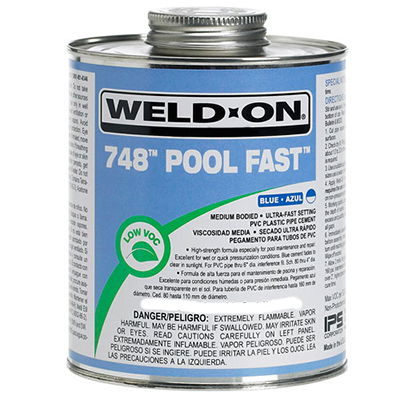 Weld-On® 748 Pool Fast™ is a low VOC emission, blue (fades to clear in sunlight), medium bodied, ultra-fast setting, high strength PVC solvent cement for all classes and schedules of pipe and fittings with interference fit through 6" diameter, Schedule 80 through 4" diameter. Not for use in a PVC system using or being tested by compressed air or gases; including air-over-water booster. Can be used without primer on non-pressure systems if local code permits. Available in 1/2 pint, pint, quart and gallon metal cans. Meets SCAQMD rule 1168/316A and ASTM D 2564 standard. LEED compliant. Shelf life of three years in a tightly sealed container.