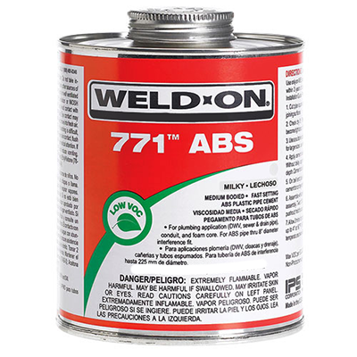 Weld-On® 771™ is a milky, or yellow, low VOC emission, medium bodied, fast setting, high strength ABS solvent cement for all classes and schedules of pipe and fittings with interference fit through 8" diameter. For use on all types of ABS plastic pipe applications, Type I and Type II. Widely used for drain, waste and vent systems (DWV), conduit and sewer applications. NOTE: Do not use primer on any kind of ASB pipe or fittings. Available in 1/4 pint, 1/2 pint, pint, quart and gallon metal cans. Meets SCAQMD rule 1168/316A and ASTM D 2235 standard. LEED compliant. Shelf life of three years in a tightly sealed container.