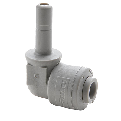 Parker A4TEU4-MG 1/4" TrueSeal™ Series Gray Acetal 90° Union Elbow, Push-To-Connect x Tube Stem, EPDM O-Ring, Metal Grip Edge