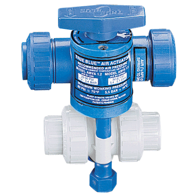 Air x air models require a 4-way air solenoid valve; fail-safe air x spring models require a 3-way air solenoid valve. Filtered and lubricated air is recommended to operate the actuators. Beneath the mounting lugs on the valve body are two hex nuts which are tapped to facilitate support of the piping assembly. Series ABVA Air pressure to open and air pressure to close; with manual override. Fits ½", ¾" & 1" ball valves. "Series ABVS Spring return kit is added to Series ABVA for normally closed or normally open operation." "Series ABRA Air pressure to open and air pressure to close; with manual override. Fits 1¼"", 1½"", & 2"" ball valves." "Series ABRS Spring return actuator for normally closed or normally-open operation; fits 1¼"", 1½"", & 2"" ball valves. Optional ABMS has manual override." Series ABVRA/ABRS Air x Air and spring return actuators for 3" and 4" sizes available as complete unit with True Blue Ball Valves