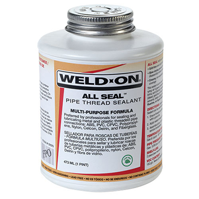 Weld-On® All Seal™ pipe thread sealant is a grit-free, soft-setting, multi-purpose sealant with low VOC (152 g/L) content for sealing and lubricating all metal and plastic (ABS, PVC, CPVC, Polypropylene & Nylon) piping systems carrying various materials. All Seal™ can be used for sealing and lubricating metal and plastic piping systems carrying: air & gases (compressed, manufactured or natural), ammonia, brine, acid (diluted), caustic alkalis (diluted), corrosives freons, fuel (diesel, gasoline, jet fuel and kerosene), oils, petroleum, propane, solvents, steam, sugar and water. Not recommended for oxygen, fluorine or liquid sodium systems.