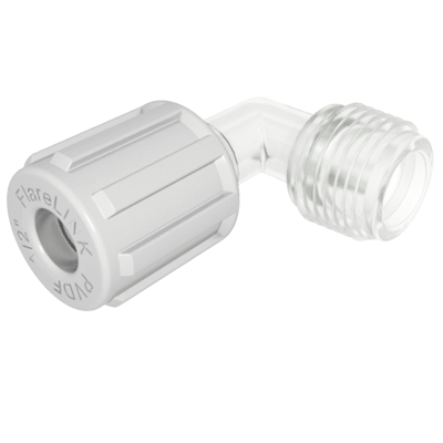 Fit-LINE ME6-8N-1 3/8" x 1/2" White PFA 90° Elbow, Male Flare x MPT Ends, PVDF Flare Nut