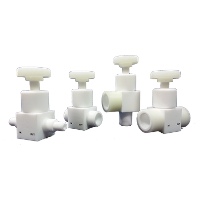 IPolymer metering valve uses a tapered plug-stem to give a fine adjustment to the flow in addition to afully open or fully closed shutoff position. The PTFE all-wetted surface design works equally well with ultra clean DI water and harsh chemical media. As with all metering valves, filtering the media prior to entering the value is recommended. These metering valves come in two configurations: Straight flow patter ("A") and Angled flow pattern ("B").