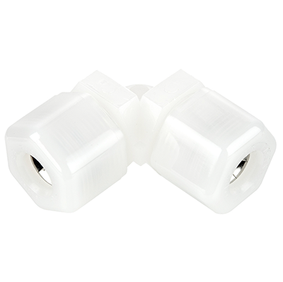 5/16" x 1/4" Union Elbow, Tube, White, Nylon, Nitrile O-rings, 302 Stainless Steel Gripper