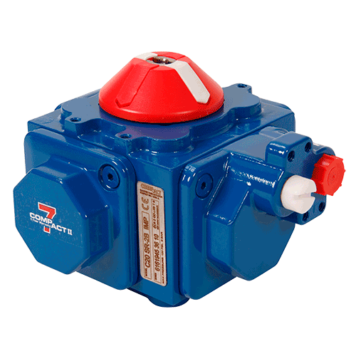 Hayward PCS pneumatic actuator offers an air-to-spring 4-piston rack & pinion design with manual override, position indicator, adjustable travel stops and ISO 5211 mounting base.