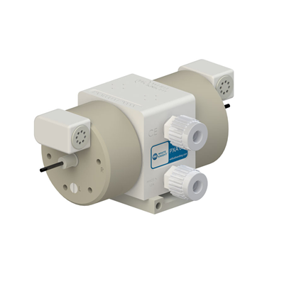 White Knight PXA030B Proximity Switch-Controlled Pumps are ideal for ultra pure delivery and recirculation applications. They are capable of 25.6 L/min (6.8 gpm) flow rates, have a maximum fluid temperature of 212°F (100°C), and can operate up to 7 Bar (100 psi) air supply pressures. It operates with proximity switches and external solenoid valve. The pump requires liquid fittings, sold separately.