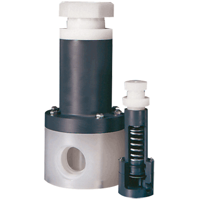The series RVDT angle pattern pressure relief valve features a single flat diaphragm which is an advantage where salt crystiallization problems can cause valve sticking. Relief setting is infinitely adjustable from 5 psi to 150 psi. The maximum inlet pressure in 210 psi. Availiable in PVC, natural poly pro, PVDF and PTFE. Seals are availble in EPDM or FKM. The adjusting bolt, lock nut and fasteners are stainless steel. The control spring is plated steel but no metal parts are in contact with liquid.