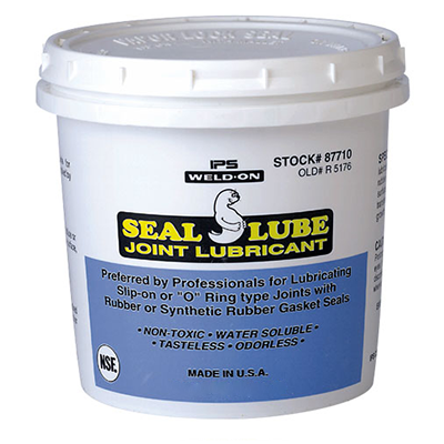 Weld-On® Seal Lube gasket lubricant primes and lubricates slip-on or "O" Ring type joints with rubber or synthetic rubber gaskets. Non-toxic and non-corrosive. No taste or odor. 100% water soluble. Available in pint, quart and gallon plastic buckets.