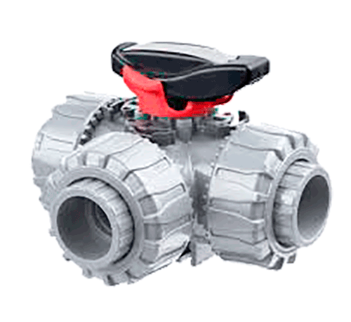 IPEX TKD Series 3-Way Automated Ball Valves can be used for flow diverting, mixing, or on/off isolation. They offer a variety of advanced features such as the patented seat stop carrier, a high quality stem and ball support system, and the new DUAL BLOCK® system which locks the union nuts preventing back-off due to vibration or thermal cycling. Deep grooves, thick O-rings, and cushioned Teflon® seats contribute to strong seals at pressures up to 232psi while an integral mounting flange and support bracketing combine for simple adaptation for actuation and anchoring. Actuators can be configured for 90° or 180° operation. TKD Series 3-Way Automated Ball Valves are part of our complete systems of pipe, valves, and fittings, engineered and manufactured to our strict quality, performance, and dimensional standards.