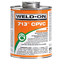 Weld-On® 713™ is an orange, low VOC emission, regular bodied, fast setting cement for copper tube size and Schedule 40 CPVC pipe and fittings with interference fit through 2" diameter. It is for use on cold and hot water copper tube size CPVC piping systems up to 180° F maximum, in residential plumbing, recreational vehicles, mobile homes and in industrial systems. 713™ is available in 1/4 pint, 1/2 pint, pint and quart metal cans. It is LEED compliant and meets ASTM F 493 and D 2846 standards and SCAQMD Rule 1168/316A. It has a shelf life of two years in a tightly sealed container.