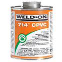 Weld-On® 714™ is an orange or gray, low VOC emission, heavy bodied, medium setting cement for all classes and schedules of CPVC pipe and fittings with interference fit through 12" diameter, including Schedule 80. It has good gas filling properties and its medium set allows for more working time in warm weather. It is for use on cold and hot water systems up to 180° F maximum, in industrial, recreational vehicles and mobile homes. 714™ Gray is available in pint and quart metal cans. 714™ Orange is available in 1/2 pint, pint, quart and gallon metal cans. It is LEED compliant and meets ASTM F 493 and D 2846 standard and SCAQMD Rule 1168/316A. It has a shelf life of two years in a tightly sealed container.
