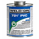 Weld-On® 721™ is a blue, low VOC emission, medium bodied, fast setting cement for use on rigid PVC pipe and fittings with an interference fit through 6" (Schedule 40) and 4" (Schedule 80). Suitable as a one step cement without primer on PVC Schedule 40 and SDR pressure piping systems through 4" diameter in irrigation, (gold course, turf and agriculture), pool & spa and non-pressure applications, unless primer is required by local code. Not for use in any other applications without primer. 721™ is available in 1/4 pint, 1/2 pint, pint, quart and gallon metal cans. It is LEED compliant and meets ASTM D 2564 standard and SCAQMD Rule 1168/316A. It has a shelf life of three years in a tightly sealed container.