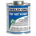 Weld-On® 738 Hot 'N Fast™ is a blue (fades to clear in sunlight), low VOC emission, medium bodied, very fast setting, high strength PVC solvent cement for all classes and schedules of pipe and fittings with interference fit through 6" diameter, Schedule 80 through 4" diameter. For use on rigid and flexible PVC pipe and fittings, including foam core and well casing. It is specially formulated for high-strength, fast-setting applications where conditions are wet, dry and/or quick pressurization is desired. 738 Hot 'N Fast™ is ideal for irrigation and agriculture applications as well as pool/spa and plumbing uses. Can be used without primer on non-pressure systems if local codes permit. Available in 1/2 pint, pint, quart and gallon metal cans. Meets SCAQMD rule 1168/316A and ASTM D 2564 standard. LEED compliant. Shelf life of three years in a tightly sealed container.