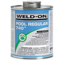 Weld-On® 740™ Pool Regular is a clear, low VOC emission, regular bodied, fast setting, high strength PVC solvent cement for all classes and schedules, except Schedule 80. It is used for pipe and fittings with an interference fit through 4" diameter. Not for use in PVC systems using or being tested by compressed air or gases; including air-over-water booster. 740™ Pool Regular is available in 1/2 pint, pint, quart and gallon metal cans. Meets SCAQMD rule 1168/316A and ASTM D 2564 standard. LEED compliant. Shelf life of three years in a tightly sealed container.