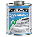 Weld-On® 744™ Pool Medium is a clear or gray, low VOC emission, medium bodied, fast setting, high strength PVC solvent cement for all classes and schedules of pipe and fittings with interference fit through 6" diameter, Schedule 80 through 4" diameter. Not for use in a PVC system using or being tested by compressed air or gases; including air-over-water booster. Can be used without primer on non-pressure systems if local codes permit. Available in 1/2 pint, pint, quart and gallon metal cans. Meets SCAQMD rule 1168/316A rule and ASTM D 2564 standard. LEED compliant. Shelf life is three years in a tightly sealed container.