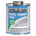 Weld-On® 746™ Pool Heavy is a clear or gray, low VOC emission, heavy bodied, medium setting, high strength PVC solvent cement for all classes and schedules of pipe and fittings including Schedule 80, with interference fit through 12" diameter. Can be used on non-pressure applications through 18" diameter. It has good gap filling properties and is recommended for solvent cementing joints where a sizable gap exists between pipe and fitting - e.g. large pipe sizes - and when more working time is required in warm weather. Not for use in a PVC system using or being tested by compressed air or gases; including air-over-water booster. Available in 1/2 pint, pint, quart and gallon metal cans. Meets SCAQMD rule 1168/316A rule and ASTM D 2564 standard. LEED compliant. Shelf life is three years in a tightly sealed container.