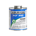 Weld-On® 717™ is a clear or gray, low VOC emission, heavy bodied, medium setting cement for all classes and schedules of pipe and fittings, including Schedule 80, with interference fit through 12" diameter. It has good gas filling properties and is recommended for solvent cementing joints where a sizable gap exists between pipe and fitting -- e.g. large pipe sizes -- and when more working time is required in warm weather. Suitable for use with potable water pressure systems, irrigation, turf, conduit, industrial pipe applications, sewer, drain, waste and vent systems. 717™ Gray cement is available in 1/2 pint, pint, quart and gallon metal cans. 717™ Clear is available in 1/4 pint, 1/2 pint, pint, quart and gallon metal cans. It is LEED compliant and meets ASTM D 2564 standard and SCAQMD Rule 1168/316A. It has a shelf life of three years in a tightly sealed container.