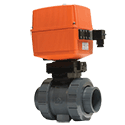 The electrically actuated Georg Fischer Type 133 ball valve is a premium actuated valve that is adaptable to a variety of conditions and applications, especially aggressive fluids and industrial applications. The Georg Fischer Type 133 ball valve is equipped with the latest technological improvements such as an optional positioner which converts the simple on/off valve to a precision flow control device which can be integrated into systems controlled by PLCs and other computerized instrumentation. Designed as a modular unit, the Georg Fischer Type 133 ball valve combines the 546 series ball valve with the EA 21 (EA31 for units 2¼" and larger) electric actuator. The EA 21 / 31 actuator was designed specifically to complement the modularity and flexibility of the 546 series valve and provide a system approach to piping system design. Georg Fischer EA 21 Electric Actuator The Georg Fischer EA 21 electric actuator is known for its 100 percent duty cycle for continuous operation, making it the perfect choice for positioning and control. Designed for a long service life of 250,000 cycles, the Georg Fischer EA 21 / 31 electric actuator comes equipped with integrated emergency manual override and automatic adjustment of voltage and frequency for on/off or process control applications. The Georg Fischer EA 21 / 31 electric actuator is available with universal automatic voltage adjustment of 100-230 VAC or a 24 AC/DC power module. Other outstanding features include an IP 67 rated housing manufactured with flame retardant fiberglass-reinforced polypropylene and all stainless steel screws. The Georg Fischer EA 21 / 31 electric actuator's ISO-Namur connection interface offers greater flexibility in adding accessories, allowing 10 options available in any combination. These include cycle time adjustment, current monitoring, cycle time monitoring, cycle counting, fail safe, heating element, and position feedback for 4 to 20mA input. Users can also quickly obtain status monitoring by installing a display for indication and configuration directly on the actuator. The Georg Fischer EA 21 / 31 electric actuator is CE, CSA, and UL (pending) certified. Georg Fischer 546 Series Ball Valve With its modular design, the Georg Fischer 546 series ball valve is ideal for virtually any application. The valve is available in PVC, CPVC. The different materials allow for a variety of chemical applications, and in many cases are an ideal fit for extreme temperatures. Easy installation is achieved with options such as threaded, flanged, or socket end connectors. Modularity allows for changes in the field such as retrofitting and actuator to a manual valve. The Georg Fischer 546 series ball valve was designed to meet the high demand world of industrial valves.